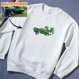 Custom Embroidered Round Neck Sweatshirt featuring a Car and Dragon Design - A Stylish Gift for Couples this Autumn and Winter.
