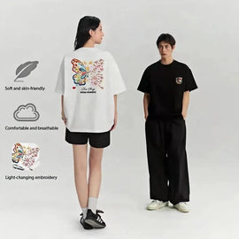 New Arrivals Summer UV-Chromic Butterfly Print Heavyweight Cotton Loose Crew Neck Couple Tee
