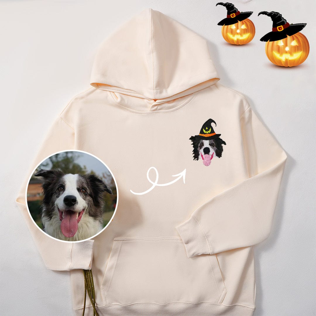 Featuring an embroidered portrait of your beloved pet paired with a playful Halloween witch hat, this charming piece combines your love for your pet with the festive spirit of the season. It's a unique and stylish way to show off your furry friend while adding a little spooky fun to your wardrobe.